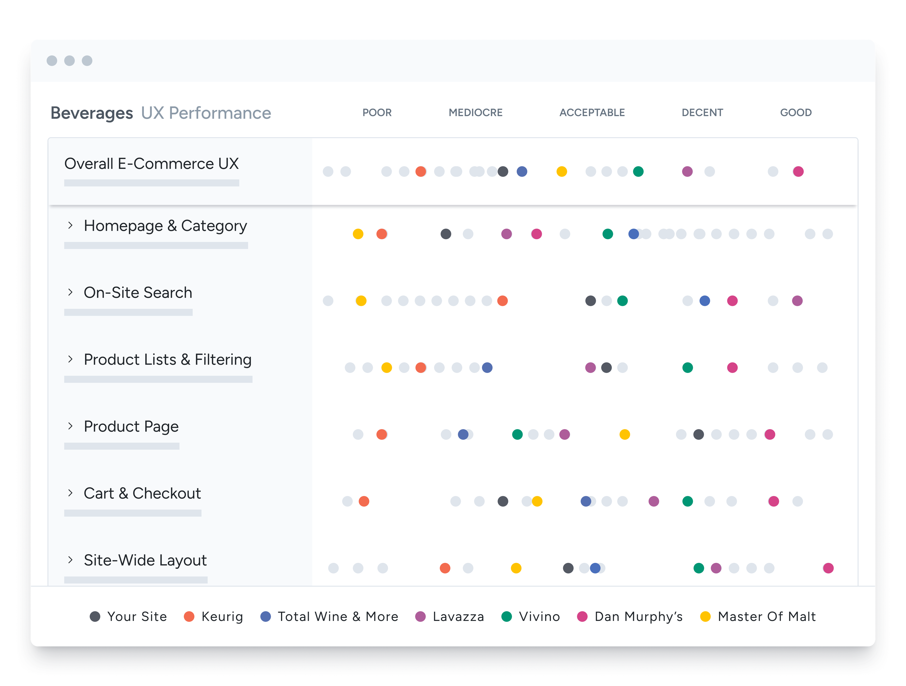 What are the top 40 UX improvements for your "Beverages" site? How does your UX performance compare to Keurig, Lavazza, Total Wine & More, Vivino, Dan Murphy’s, Master Of Malt, and The Whisky Exchange?