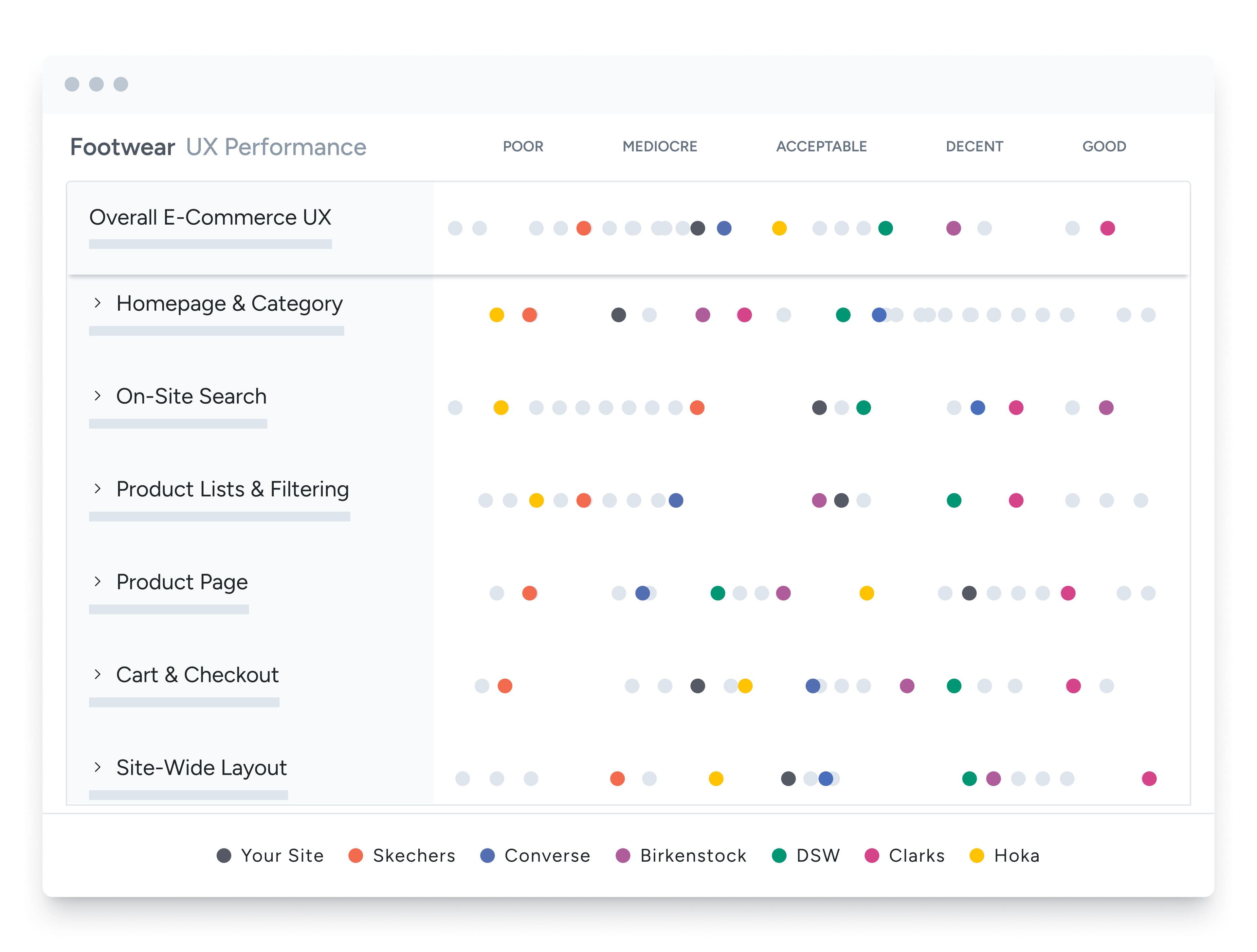 Benchmarking of 8 footwear sites across the 480+ Footwear guidelines resulting in 2,900+ UX performance scores and 3,500+ best practice examples from sites like: Skechers, Converse, Birkenstock, DSW, Clarks, Jimmy Choo, schuh, and Hoka.
