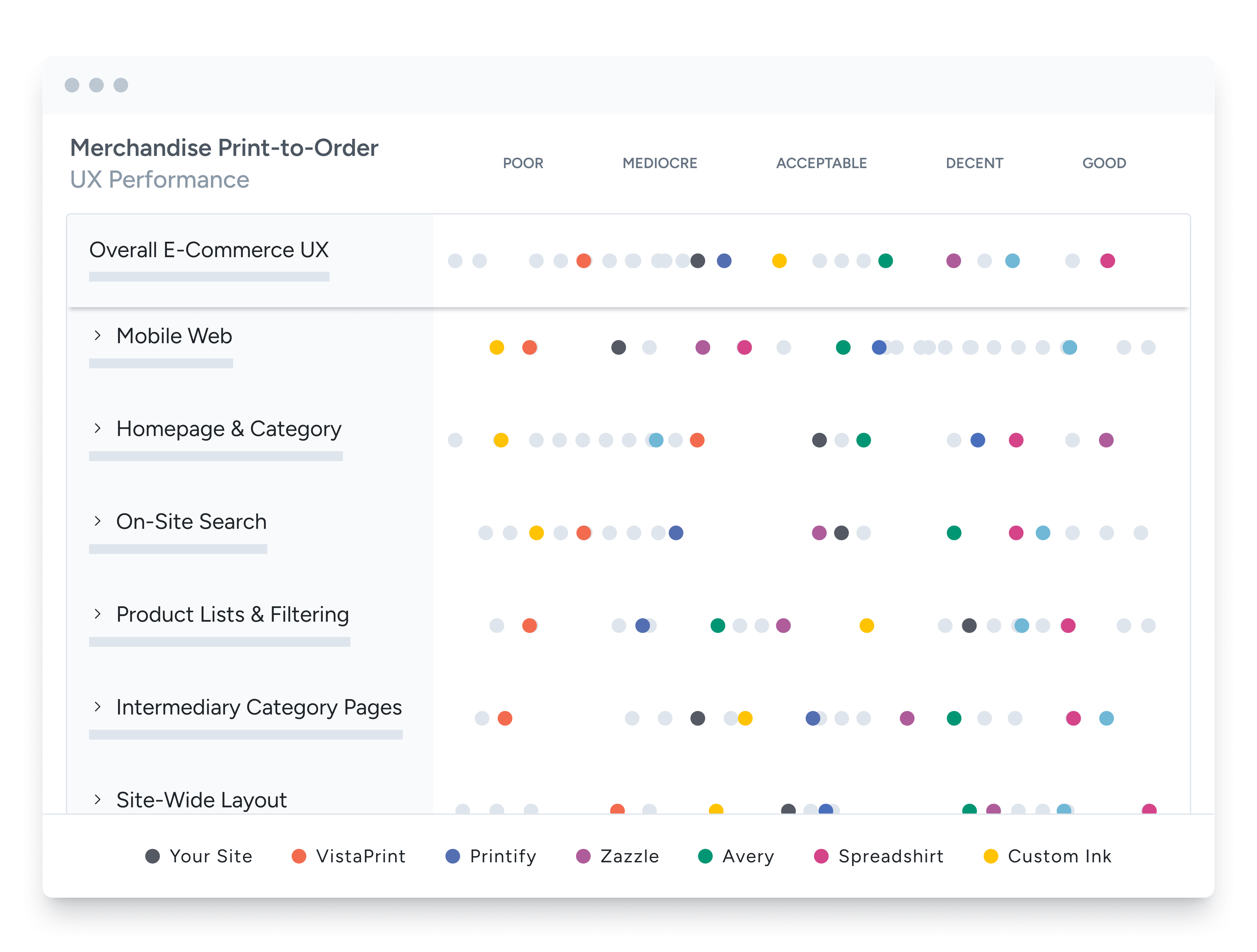 Benchmarking of 7 merchandise and print-to-order sites across 440+ Merchandise & Print-to-Order UX guidelines resulting in 3,100+ UX performance scores and 2,300+ best practice examples from sites such as VistaPrint, Printify, Zazzle, Printful, Avery, Spreadshirt, and Custom Ink.